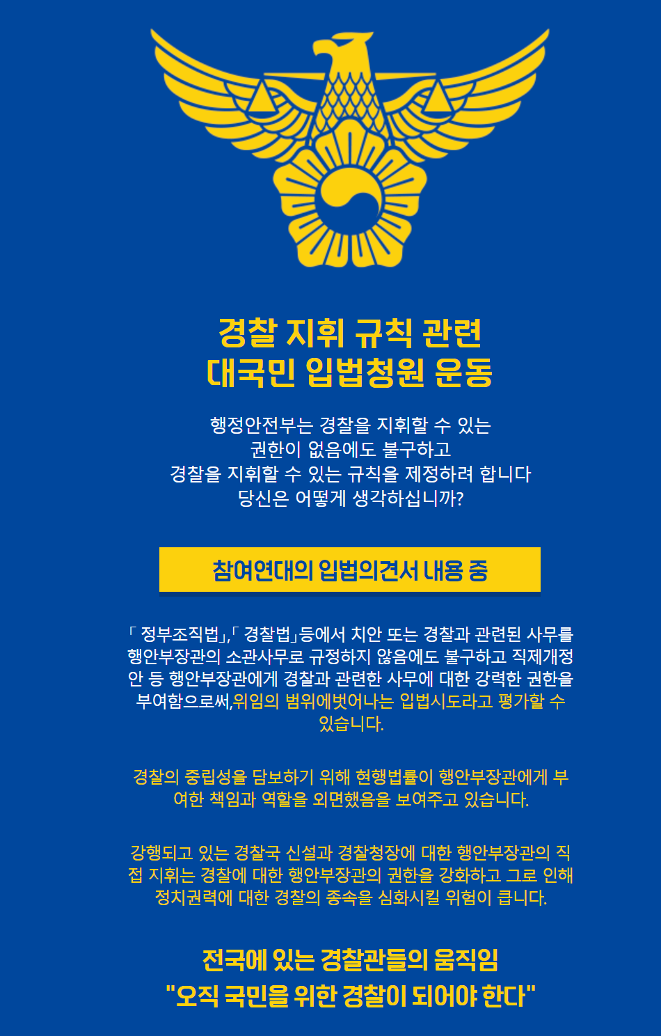 찬성측 의견과 반대측 의견이 서로 대립하고있지만 국민들의 의견은 반대측에 기울고 있는 듯 합니다. '경찰국 신설 반대'청원은 9시간 만에 20만명을 돌파하였습니다. 경찰 직협은 누리집에 “행정안전부는 경찰을 지휘할 수 있는 권한이 없는데도 경찰을 지휘할 수 있는 규칙을 제정하려 한다”, “강행되고 있는 경찰국 신설과 경찰청장에 대한 행안부 장관의 직접 지휘는 경찰에 대한 행안부 장관의 권한을 강화하고 그로 인해 정치권력에 대한 경찰의 종속을 심화시킬 위험이 크다” 라고 이야기 하고 있습니다.