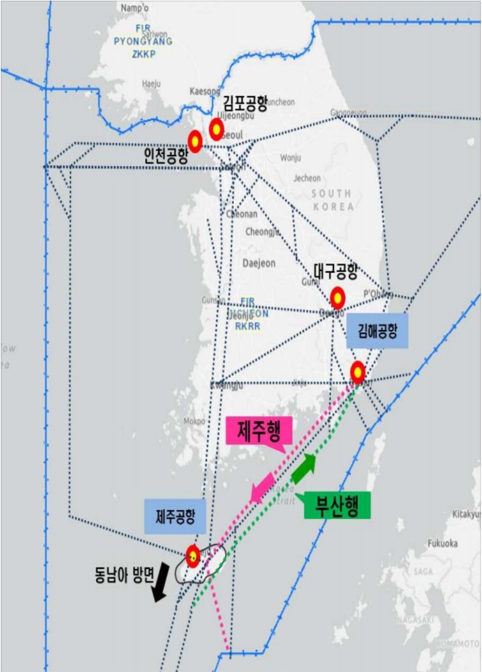 국토교통부는 항공안전과 운항효율성 향상을 위해 12월 1일부터 제주~부산 간 남해 항공로 약 300km를 복선화한다 밝혔습니다. 그간 제주~부산간 남해 항공로는 단선 항공로에서 고도를 분리하여 교행하는 방식으로 운영하였는데요. 증가하는 교통량 처리를 위해 개선이 필요했습니다.