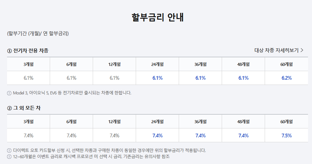 할부 금리가 정말 많이 올랐네요. 할부 이자가 2배 가까이 늘어나니 많은 계약자 분들이 계약을 취소하고 신차 구매도 망설이고 계시는 것 같습니다.