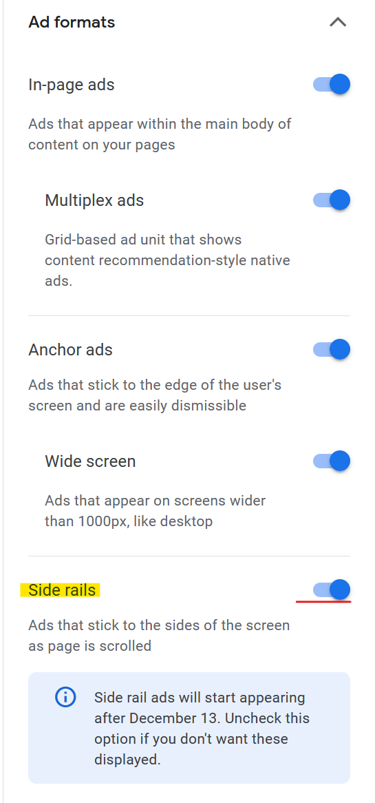 사이드 레일 광고 사용을 원치 않으신다면 위 'Side rails'옵션을 비활성화 하시면 사이트에 사이드 레일 광고가 표시되지 않습니다. 더 자세한 정보는 아래 애드센스 공식 소개자료 남겨놓겠습니다.