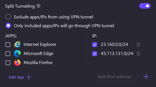 Only included apps/Ips will go through VPN tunnel을 체크하시고 Add IPv4 address에 아래 Ip를 추가하세요.