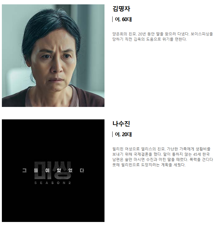 - 백일두(50대): 만년경장 딱지를 떼고 드디어 실종전담반 팀장으로 승진했다.
