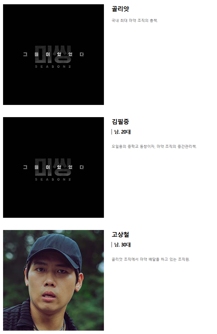- 이만식(40대): 현재 마약반 팀장. 얼핏 보면 얼굴에 짜증이 가득이고 후배들에게 툴툴 거리는 것 같지만, 알고 보면 성격도 성향도 모든 것이 원만한 직장인(?) 타입. 경찰청 내에서 평판 좋고. 눈치 빠르고 적당히 운도 있어 실적도 좋다.