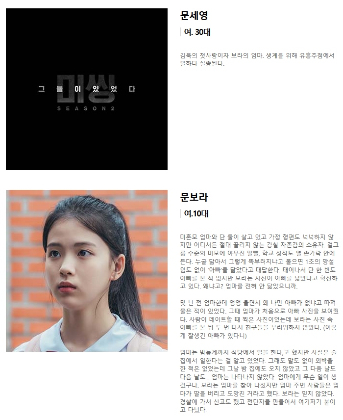 - 이로하(9세 / 3공단 거주 8년): 부모에게 보살핌을 받지 못한 채 노숙생활을 하다가 실종됐다. 또래 아이들보다 의젓하고 눈치도 빠르다.