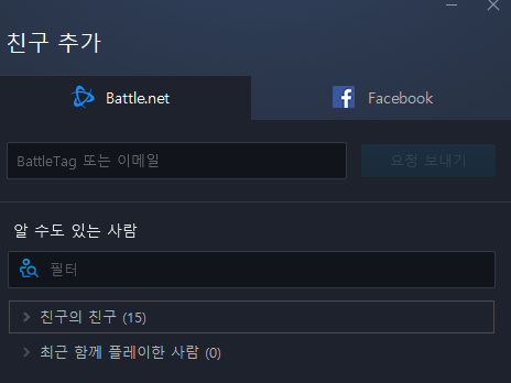 배틀넷 앱 내에서 친구추가를 클릭하시고 BattleTag 또는 이메일을 입력합니다. 그 뒤 요청 보내기를 누르면 정상적으로 친구가 모두 표시되게 됩니다. 원래 친구였던 친구에게 요청을 하면 안되고 새로운 유저에게 친구추가 요청을 보내셔야합니다.
