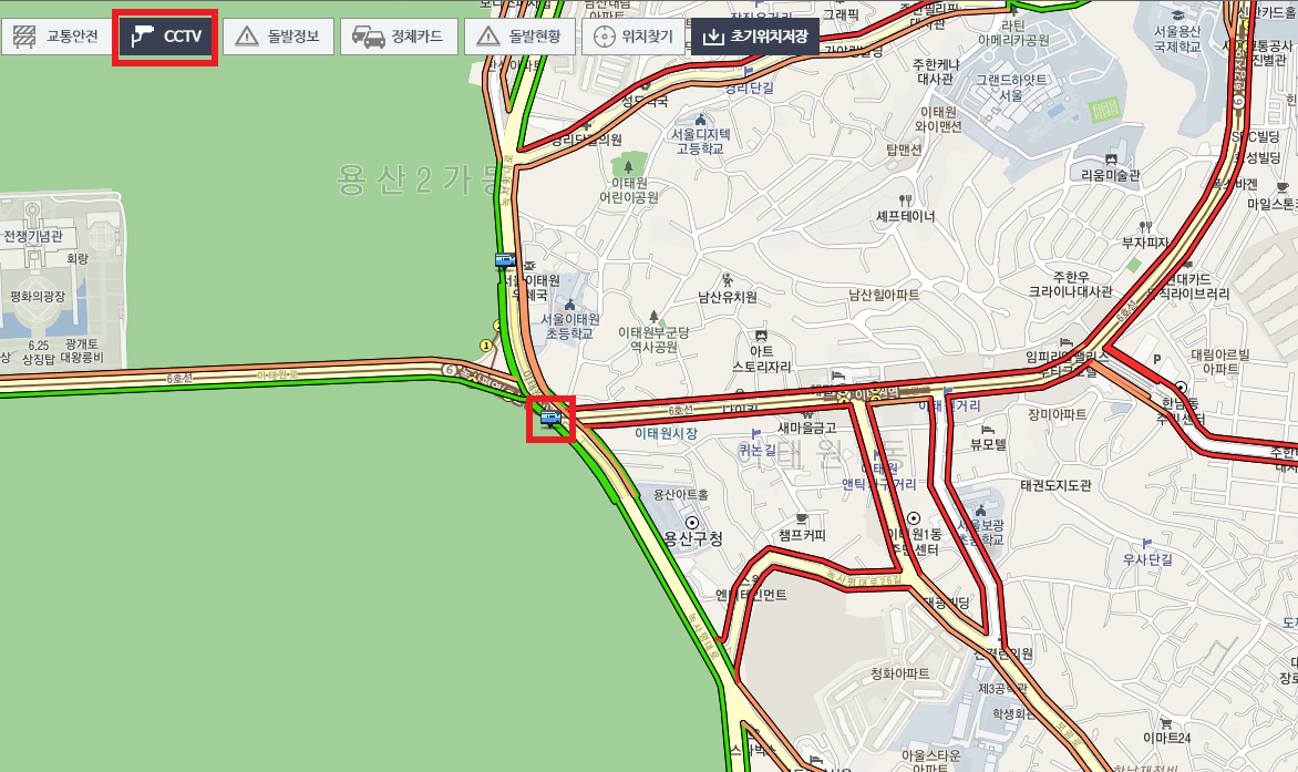 경찰청 도시교통정보센터에 접속한 뒤 우측 상단 CCTV 버튼을 눌러 CCTV를 켜줍니다. 그리고 녹사평역으로 이동하신 뒤 아래 사진에 표시되어있는 CCTV를 누르시면 현재 상황을 CCTV로 보실 수 있습니다.