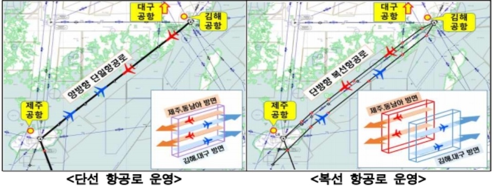 - 안전문제 개선: 복선화를 통해 제주방향과 부산방향으로 각각 분리 운영하여 마주오는 항공기의 상승·강하 중 발생할 수 있는 항공기간 근접 가능성을 차단하여 항행 안정성을 제고할 수 있습니다.