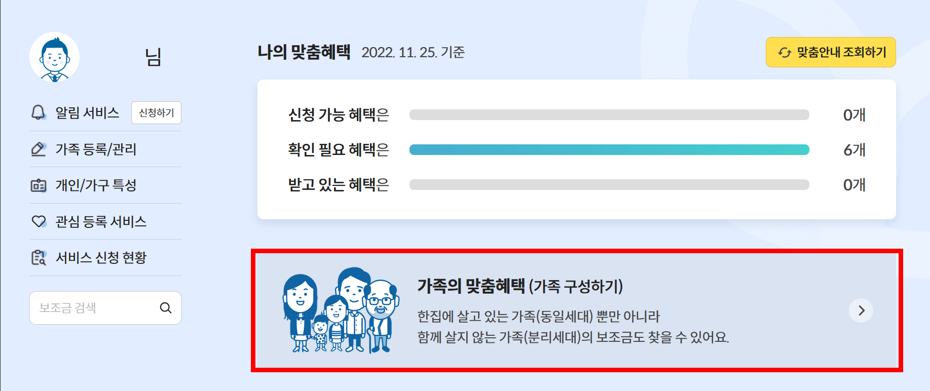 주민등록상 동일 세대 가족과 가족관계등록부상 직계존비속 관계의 가족도 추가하여 가족의 보조금 확인 및 신청 또한 가능합니다.
