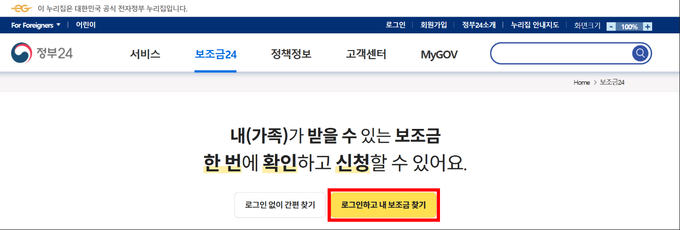 1. 보조금 24 홈페이지에 접속, '로그인하고 내 보조금 찾기' 버튼을 클릭합니다.
