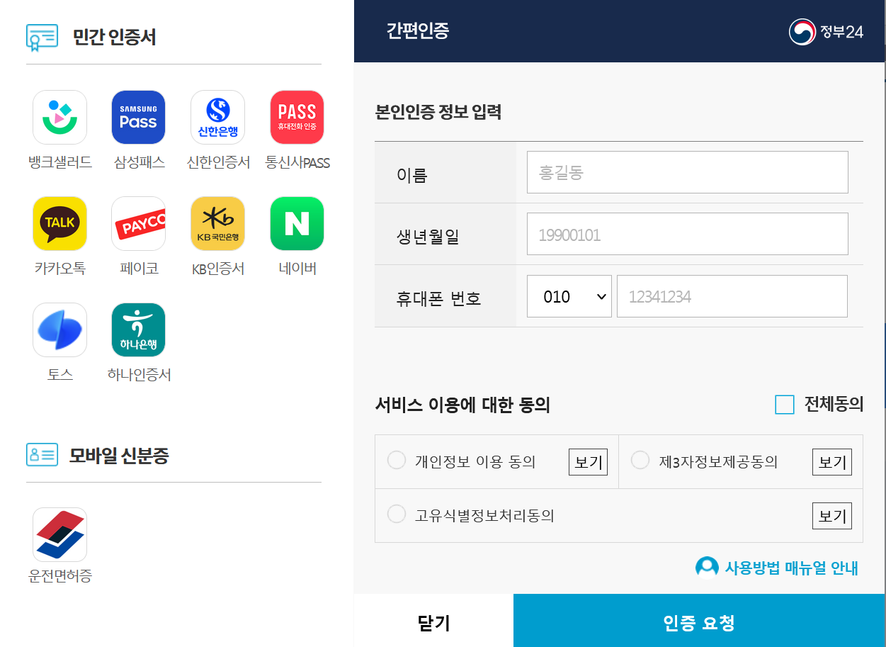 2. 원하는 방법으로 로그인을 진행합니다. 간편인증의 경우 뱅크샐러드, 삼성패스, 신한인증서, 통신사PASS, 카카오톡, 페이코, KB인증서, 네이버, 토스, 하나인증서, 모바일신분증(운전면허증)을 지원합니다.