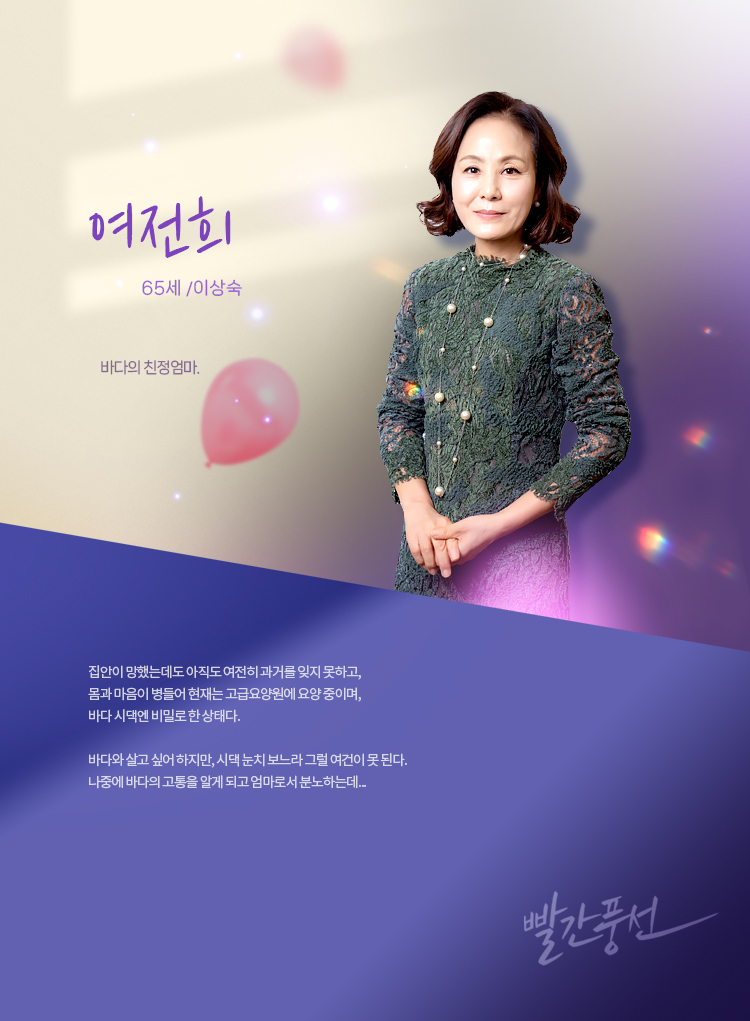 - 여전희(65세): 집안이 망했는데도 여전히 과거를 잊지 못하고 고급 요양원에 요양 중이다.