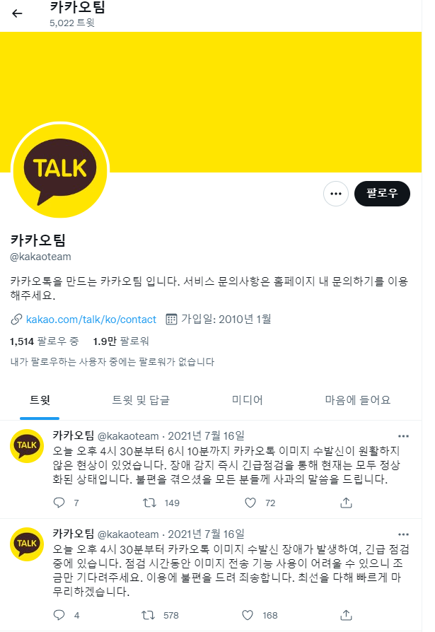 아직 카카오팀 트위터에는 공지사항이 없는걸 보아 상황파악 중이거나 장애가 발생하여 긴급히 점검하고 있는 것으로 추정됩니다. 이런 장애가 발생한 이유로는 Ddos 공격, 해킹, 오류 발생 등 다양한 추측이 있지만 아직 공식적인 입장은 나오지 않은 상황입니다.