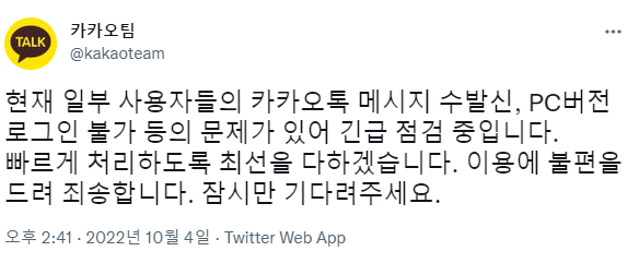 카카오팀 공식 트위터에 공지사항이 올라왔습니다. 공지사항에 따르면 카카오톡은 현재 메시지 수발신과 PC버전 로그인 불가 등의 문제가 있어 긴급 점검 중인 것으로 보입니다.