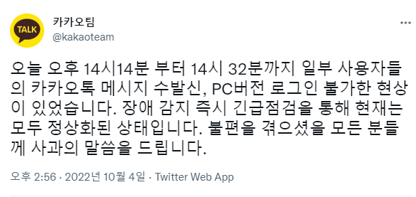 2022년 10월 4일 카카오톡 안됨 | 서버 터짐